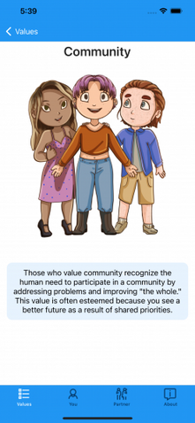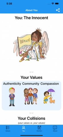 The Pro version of Value8 introduces a partnership feature. With this upgrade, users can view their partner's values, their corresponding archetypes, and any conflicts or synergies that arise within the relationship. This Pro version requires a one-time purchase. Additionally, users can submit any conflicts with their partners for review, and these, too, are shared with the app's community.
